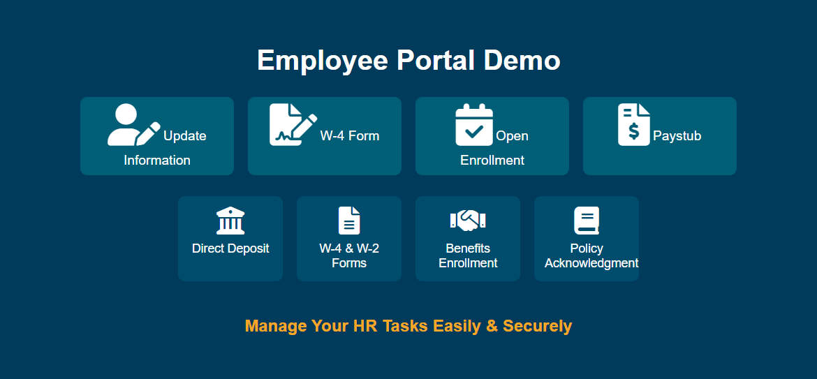 This video demonstrates the core functionalities of the employee portal, including how employees can update personal information, enroll in direct deposit, adjust direct deposit details, review W-4 tax withholdings, view paystubs, access W-2 forms, complete open enrollment tasks, and acknowledge policies. The portal provides a seamless and secure way for employees to manage their HR-related activities.